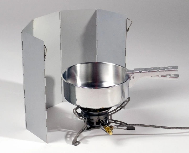 Aus fünf (Gr. XL acht) Aluminiumlamellen aufgestellter Windschutz, steigert die Heizleistung der Kocher wesentlich.
