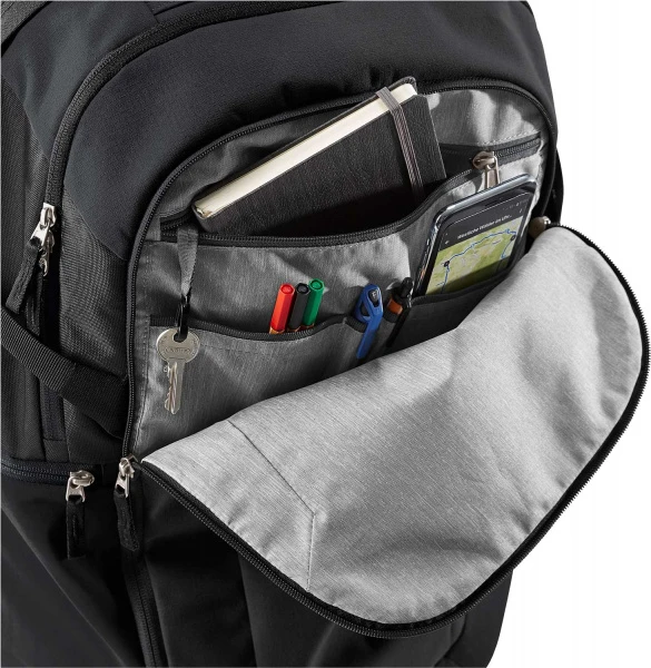 Großes, ordnertaugliches Hauptfach mit integriertem Dokumentenfach, zweites, großes und rundum gepolstertes Hauptfach passend für 17” Laptop- und Tablet-PC-Fach, Wertsacheninnenfach, Brustgurt, Lageverstellriemen, Vortasche mit Organisation und großer Öffnung für perfekte Übersicht, zwei elastische Seitentaschen.