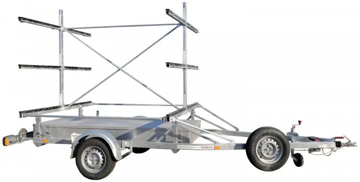 Der ideale Anhänger für Einer oder Zweierkajaks, da einfaches Beladen von der Seite. Auf den abgebildeten Trailer lassen sich mühelos 18 Einerkajaks oder 6 Canadier laden.