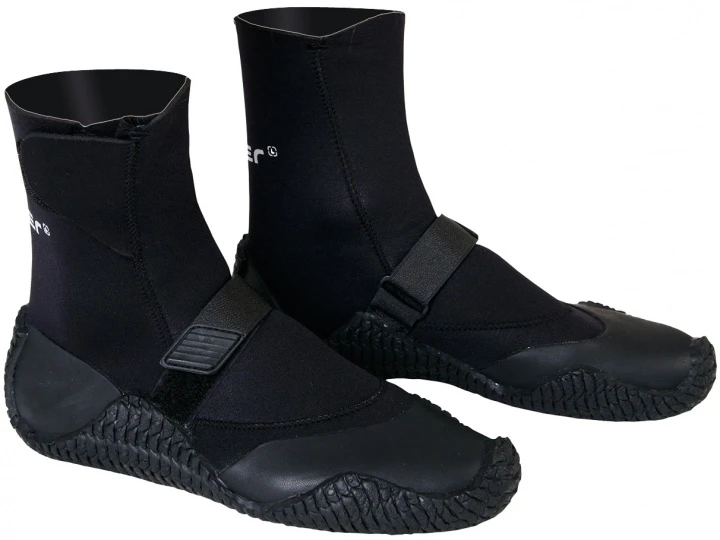 Durch den Klettverschluss über den Spann wird der Fuß richtig fixiert. Hochelastisches 3 mm Neopren isoliert hervorragend und macht den Einstieg ganz einfach. Die griffige Gummisohle ist anvulkanisiert, mit dem versteiften Fersenbereich hat der Fuß Halt. Die seitlich hochgezogenen Kanten der Sohle bieten optimalen Sitz und Verschleißschutz. Alle Nähte sind geklebt und blindstichvernäht.