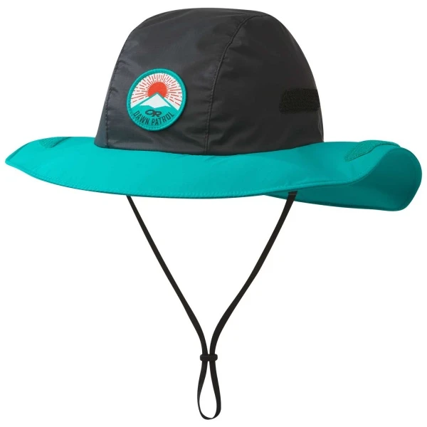 Beweglicher, mit Schaumstoff versteifter Rand. Klettverstellung, unterschiedliche Krempenbreite, Einhandbedienung, abnehmbares Kinnband, verpackbar, wasserdicht und schnell trocknend.