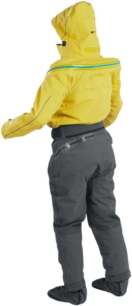 Im Gegensatz zu anderen Trockenanzügen mit Latex am Hals macht der GlideSkin Neoprenkragen keine Probleme bei Salzwasser und hält fast genauso dicht. Der fleecegefütterte Kragen zusammen mit der einrollbaren und verstellbaren Kapuze schützt auch bei stürmischen Bedingungen. Der YKK AquaSeal Einstiegs-RV am Rücken und für die DropSeat Funktion sind gut zu bedienen, die fleecegefütterte Fronttasche wärmt bei Bedarf auch die Hände, ein verstellbarer Neopren Außenkamin, Reflektoren und Verstärkungen im Gesäß- und Kniebereich machen die Ausstattung komplett.