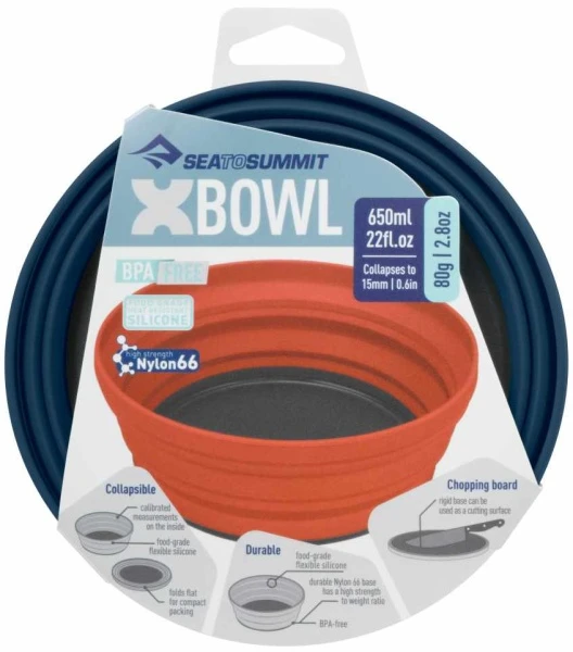 Faltbare Schüssel aus Lebensmittelechtem, flexlibem Silikon mit einem schnittfesten Boden. Kann auch als Teller benutzt werden wenn man den Rand herunterfaltet.