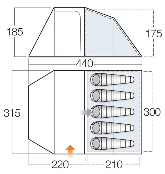 Das Skye betritt man durch einen Seiteneingang in den Innenraum mit voller Stehhöhe. Es ist ein einfach aufzubauendes Tunnelzelt mit drei Gestängebögen. Klare Fenster schaffen Licht in den großen Vorraum, während die „lights out“ Schlafkabine Dunkelheit für besseren Schlaf bietet.